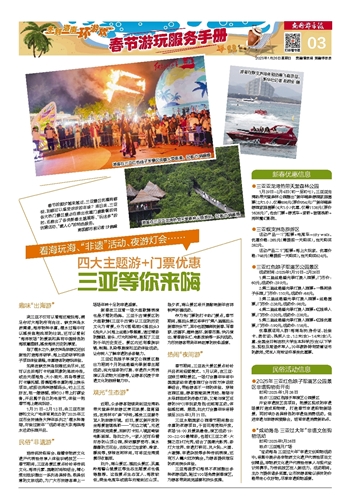 春节的脚步越来越近,三亚景区优惠有哪些,到哪可以感受浓浓的年味?连日来,三亚各大热门景区景点在推出优惠门票套餐的同时,还推出了各类新春主题展陈、“玩法多”的创意活动、“暖人心”的特色服务。南国都市报记者 沙晓峰