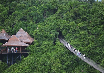 近期,众多游客陆续来到亚龙湾热带天堂森林旅游区赏花观景、登高望远,在雨林中“森”呼吸,感受三亚暖冬宜人的旅游环境。近日,景区新开放的全海景玻璃栈桥——“无边之境”,无遮挡的视觉美景,拍照打卡如入境宫崎骏电影画面。除此之外,一家人还可沿着环形的山顶公园,探访藤萝密布、溪水潺潺的兰花谷,去玩过江龙索桥、滑索、漂流等,穿梭在树林间,可将亚龙湾美景尽收眼底。