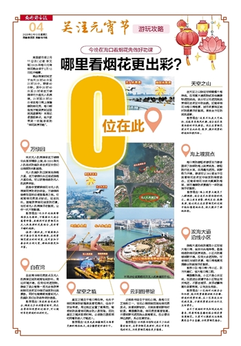 南国都市报2月11日讯(记者 李文韬)2025年海口元宵烟花晚会将于2月12日拉开帷幕。晚会表演时间定于当天20时40分至21时20分,持续40分钟,其中20时40分至21时将在万绿园举行大型无人机表演,21时至21时20分将在海口湾上演璀璨的烟花秀。海口哪些地方能观赏到这场视觉盛宴呢?本报记者提前踩点,给大家带来一份超详实的“烟花观赏攻略”。