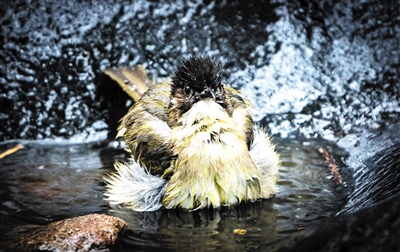 白头鹎在水里泡澡降温。