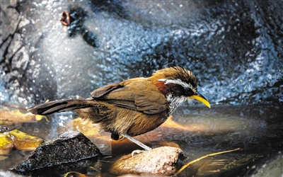 棕颈钩嘴鹛在喝水。