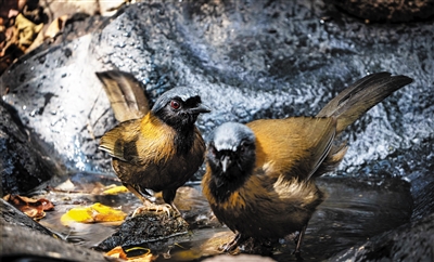 黑喉噪鹛洗澡降温。