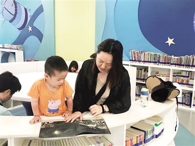 少年儿童馆里,家长与孩子共读。
