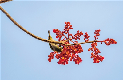 南国都市报5月5日讯(记者 刘孙谋 文/图)五月的清晨,在海南热带雨林国家公园陵水吊罗山片区,有火红色吊花挂满整棵树,枝头上站着不少小鸟在吸食花蜜,走近一看,原是濒危植物美丽火桐正在绽放。