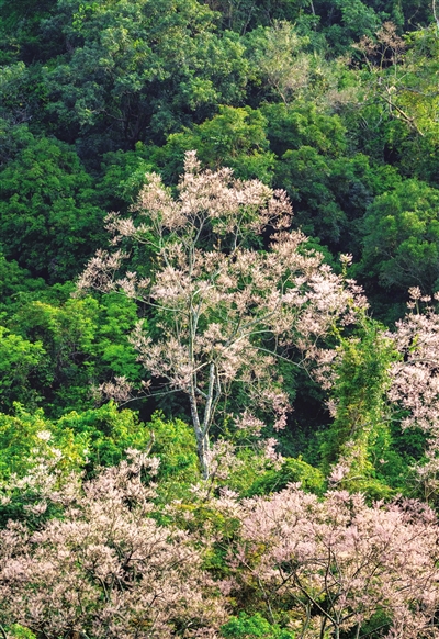 同样是在海南热带雨林国家公园陵水吊罗山片区,国家二级保护植物海南梧桐迎来盛花期,这些树冠直径超15米的“雨林巨伞”,此刻正从叶腋处吐出成串淡紫色“星星”,用满树繁花演绎着独属热带的生存智慧。