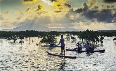 南国都市报5月5日讯(记者 刘孙谋 文/图)走在陵水桐海村彩虹堤坝旁,翠绿的红树林倒映在海水里,游客划着桨板在夕阳中嬉戏,品着一杯咖啡享受海风轻拂。