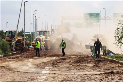 5月4日,在特拉维夫本-古里安国际机场附近,应急人员清理一条道路。新华社/法新