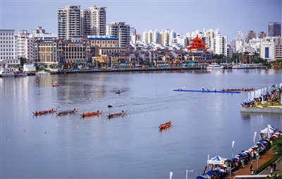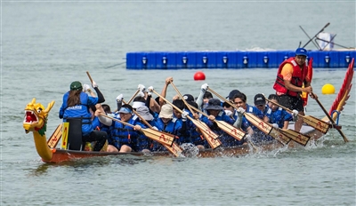 海南省海归人员龙舟队在比赛中。(本版图片均由记者 李昊 摄)