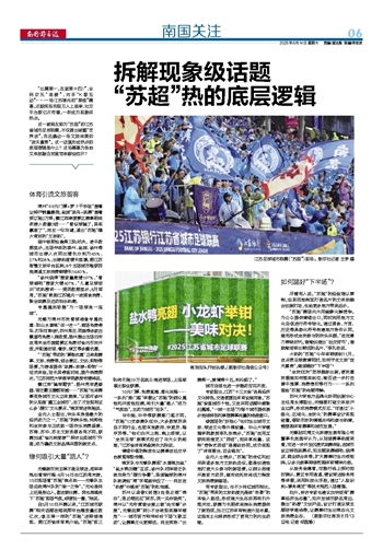 有专家指出,与不少网红城市相比,“苏超”带来的文旅热度先是被“形散”的本省人盘活,形成强大生态后再吸引外部关注;联赛为长期夜间娱乐消费提供了新选项,加之江苏体育制造外延丰富,这些本土化特质形成了更有力的内生动能。