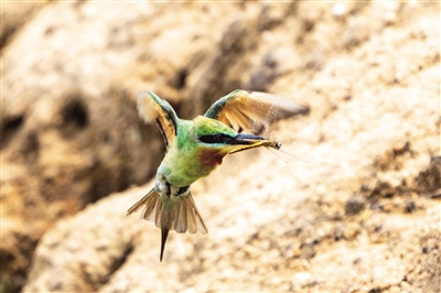 栗喉蜂虎是蜂虎科蜂虎属的鸟类,喉部栗红色,翅膀和背部呈绿色,尾翼为蓝色,翅膀内侧橙黄色,在阳光照耀下,全身闪烁着金属般的光泽,“中国最美小鸟”实至名归。它们不仅外貌出众,飞行技术更是高超,能在空中做出急速飞行、滑翔、悬停、急速回转和仰俯等高难度动作,是天空中当之无愧的舞者。