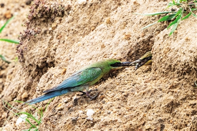 近日,海南省澄迈县澄迈湾迎来一场别开生面的自然盛会——栗喉蜂虎幼鸟的首次飞行。这些被誉为“中国最美小鸟”的小家伙们,在历经一个多月的孵化和育雏后,终于迈出了探索世界的第一步。在澄迈湾的一处斜坡沙土坑,这里是栗喉蜂虎的育雏天堂。斜坡上分布着几十个洞口,时不时有栗喉蜂虎幼鸟好奇地探出头,小心翼翼地张望着这个陌生又充满诱惑的世界,差不多有六七窝幼鸟断断续续探出头来。一旦察觉到异样,它们便迅速缩回洞穴,如同害羞的小精灵。