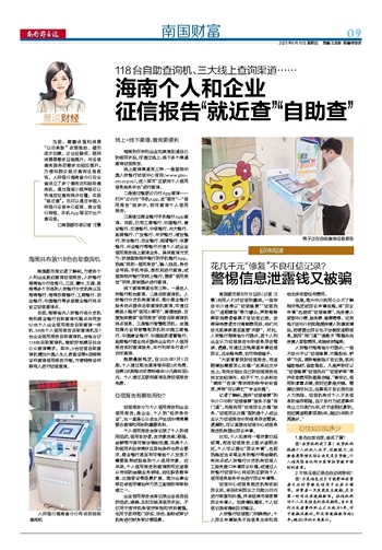 南国都市报记者了解到,为便利个人和企业就近查询征信报告,人民银行海南省分行在海口、三亚、儋州、文昌、琼海等多个市县的人民银行分支机构以及海南银行、海南农商银行、工商银行、农业银行、中国银行等多家商业银行网点设立征信查询点。