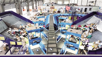 在重庆市秀山土家族苗族自治县武陵现代物流园区快递分拨中心,工作人员在智能快递分拣流水线上作业。(图片源于新华社)