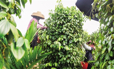 7月13日,村民在海口市琼山区大坡镇福佳村胡椒地采摘胡椒。近期,海南胡椒迎来采摘收获季。据悉,胡椒是海南最具特色的热作产业之一,全省种植面积32万亩,产量约4万吨。新华社记者 杨冠宇 摄