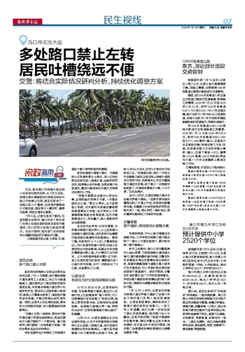 近日,家住海口市滨海大道沿线小区的多位居民反映,从7月12日起,滨海大道从海港路到长滨路沿线多处路口开始禁止左转,甚至还取消了一些路口的人行横道,沿线居民需要绕行才能回家,甚至有行人翻护栏、横穿马路等,导致交通安全隐患。7月14日,记者在现场了解到,在接到群众反馈后,海口市多个有关部门负责人也组成调研组来到现场开展调研,深入研判分析路口路段的情况。试运行期间,相关部门也将持续优化调整该路段的交通组织方案。
