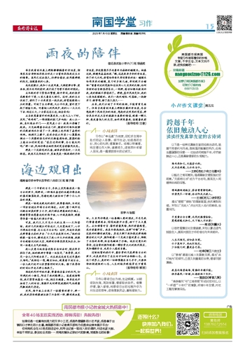 后来,我们分到了不同的班级,不能常常见面了。但每当我看到书桌上那瓶珍藏的幸运星,总会想起那个风雨交加的雨夜,想起好友明亮的笑容,那份来自好友无言的鼓励与真挚的情谊,就像一颗火种,散发着恒久的光芒,始终照亮着我、温暖着我前行。(指导老师:王敏)