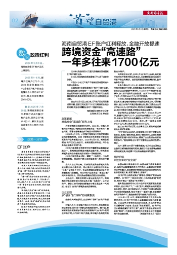 2024年4月3日,人民银行海南省分行制定跨境资金流动管理制度,出台《海南自由贸易港多功能自由贸易账户业务管理办法》。2024年5月6日,海南自贸港EF账户正式上线运行,受到经营主体欢迎,开办业务的企业稳步有序扩容。