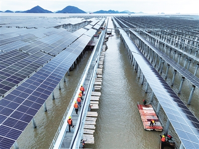 在浙江省台州市三门县,工作人员安装光伏板(2024 年 3 月摄 图片来 自《瞭望》新闻周刊)