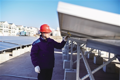 2023年11月,工人在内蒙古乌海市第八中学餐厅屋顶检查光伏设备 (新华社发)