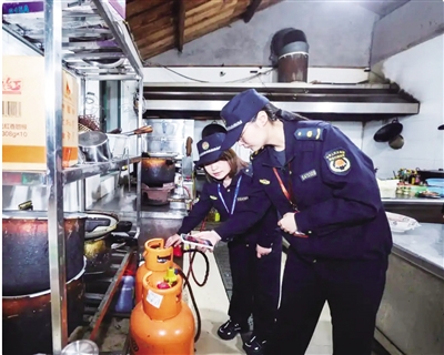 浙江省湖州市吴兴区道场乡综合执法人员在农家乐后厨检查燃气安全(新华社记者 徐昱 摄)