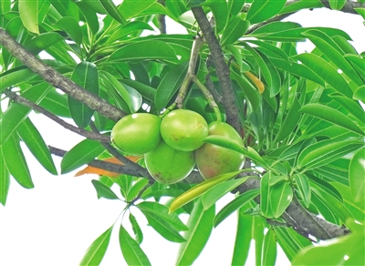 南国都市报9月11日讯(记者 汪承贤 文/图)近日,海口五源河湿地公园入海口处的果林挂满果实,外形酷似芒果,吸引不少游客注意。经确认,该植物为海杧果,又名牛心荔、山杧果,属夹竹桃科常绿乔木。尽管其果实外观诱人,但全身有剧毒,尤其果实和汁液毒性极强,误食可能致命。据悉,海杧果广泛分布于海南、广东、广西、福建和台湾等沿海热带地区,树高一般不超过8米,树皮灰褐色,受损后会流出乳白色有毒汁液。若汁液接触眼睛,可能造成严重伤害甚至失明。其叶片厚纸质,花呈白色、芳香,花期可从春季持续至10月,果期则从7月延续至次年春天,果实成熟时由绿转为紫红色。