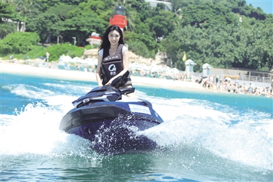 游客在三亚蜈支洲岛旅游区体验摩托艇。(三亚蜈支洲岛旅游区供图)