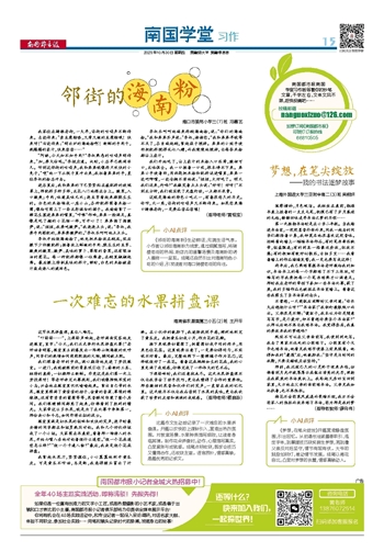 《邻街的海南粉》生动鲜活,充满生活气息。小作者以邻街海南粉为线索,通过细腻描写,将骑楼老街的热闹、粉店内的温馨场景及海南粉的诱人模样一一呈现。结尾还自然引出对海南特色小吃的介绍,引发读者对海口骑楼老街的向往。