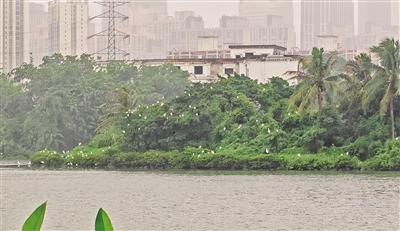 海口红城湖公园的湖心岛上有大量鹭鸟。