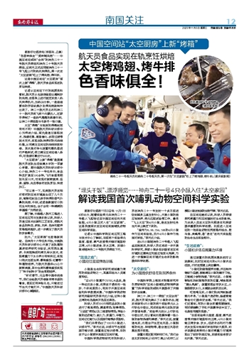 据新华社酒泉电(李国利、占康)“色香味俱全”“美味啊鸡翅”……中国空间站顺利“会师”的神舟二十一号航天员乘组和神舟二十号航天员乘组,这两天正式启用随神舟二十一号飞船上行的热风烘烤机,第一次在“太空家园”吃上了烤鸡翅、烤牛排。这是中国空间站“太空厨房”首次上新“烤箱”,航天员食品实现在轨烹饪烘焙。