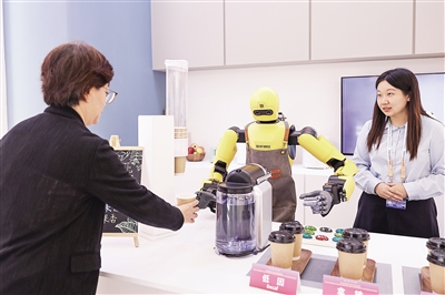 10月14日,参观者在中国妇女儿童博物馆体验机器人制作咖啡