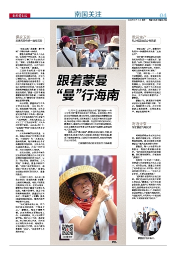 12月14日,由海南省妇联主办的“曼行海南——伟大女性之旅”宣传活动走进三亚西岛。中央民族大学历史文化学院教授、博士生导师,全国妇联副主席蒙曼走进西岛的街头巷尾,近距离感受了这座百年渔村的历史脉络,聆听西岛女民兵巾帼故事。在接受本报记者专访时,蒙曼表示,海南杰出女性精神与本土历史文脉深度联结,历史上海南杰出女性身上所体现的开拓精神、坚韧品质令人无比敬佩。据悉,此次“曼行海南”,蒙曼先后抵达海口、文昌、琼海等市县,拜谒了冼夫人纪念馆、红色娘子军纪念园,参观了海南省博物馆、文昌航天发射基地等,持续追寻海南杰出女性足迹。