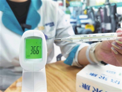 国药控股海南有限公司专业药房金盘店店长张虹,用店内在售的水银体温计与非接触式红外体温计为记者实测。她先用红外体温计对准记者额头,按下按键“嘀”声一响,仅1秒,屏幕便显示36.6℃。