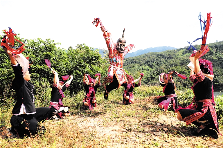 陈秀兴家住在五指山市南圣镇什洪村,整个村庄坐落在青山脚下,抬头就能看到连绵起伏的山峦。自14岁起,他便跟随父亲在海南各个市县以苗族“道公”的身份祭祀祈祷,经过多年的学习,掌握了盘皇舞的仪式。如今年过半百的他,日前荣获第六批国家级非物质文化遗产代表性传承人。