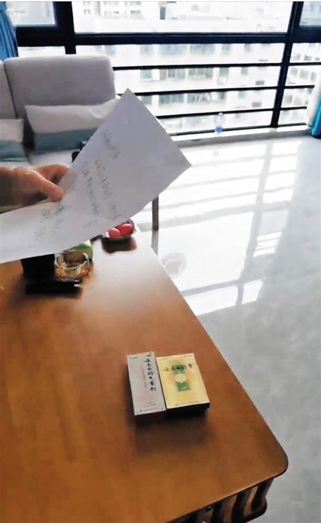 在离开时,为了不打扰刘均莲,女兵们悄悄给她留下了一张表达感谢和祝福的小纸条。得知当天刘均莲因提前来打扫房间时还不慎摔倒了,女兵们还留下了两盒治疗跌打损伤的药。