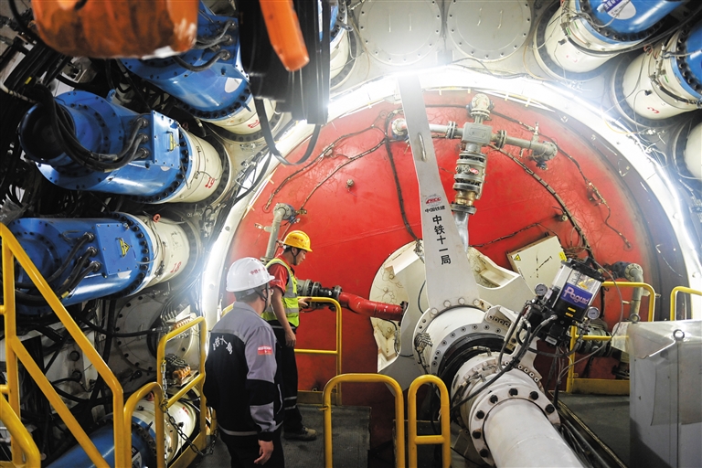 10月22日,中铁十一局技术人员在甬舟铁路金塘海底隧道“定海号”盾构机内作业。