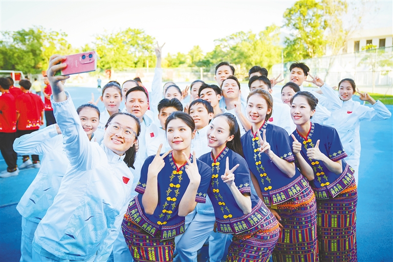 海南代表团运动员身穿团服、民族服饰合影留念。