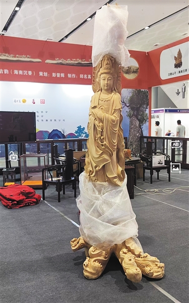 “这可是我们的‘镇馆之宝’!”在海南沉香文化展区,一尊高大的木雕观音像虽然还未拆封完毕,但高大的尺寸,让它在馆内尤其显眼。