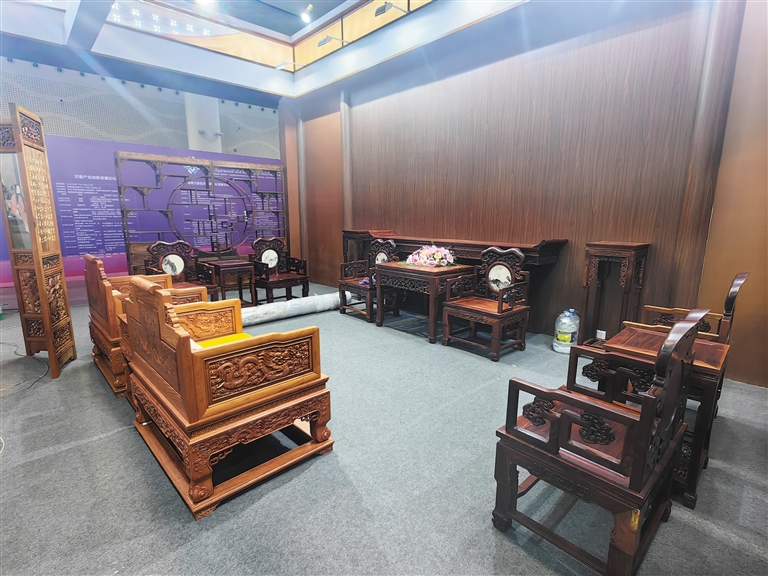 记者在现场还看到木质整套家具制品,牛帅指着正在拆封的箱子说:“这是一套龙凤箱,是11年前以金丝楠木打造而成,如今再打开依然带着天然的木香。这套龙凤箱一般用作嫁妆,寓意龙凤呈祥。”