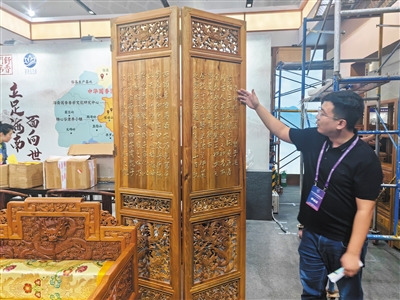 “我们总共带来了价值约500万元的展品,包括‘舒香门弟’的沉香制品以及蓝莲花木业的木制家具系列。”蓝莲花木业总经理牛帅介绍,“这套由金丝楠木打造的屏风是我们的珍藏品,共12扇,总值约45万-50万元。屏风的一面是阳雕工艺雕刻洛神赋,材质是纯金箔纸贴制而成;另一面是取自清雍正12美人图。”