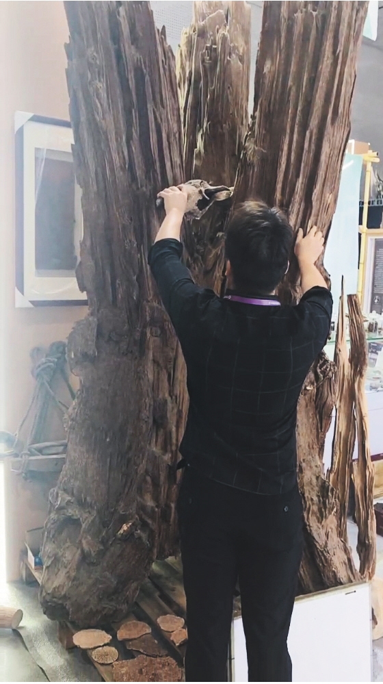 “我们带来了不少香制品,线香、盘香,还有我们自行研发的超微沉香茶。”来自广东省茂名市的太古沉香有限公司总经理钟春晓正在悉心摆放线香产品。“我们公司有自播平台,也会供给达播进行直播带货,线上销售渠道较稳定。”钟春晓说:“这次来参加沉香花梨国际大会,我们也会在展会现场进行直播。大会给我们提供了一个好的交流平台,我们也想让更多人了解我们广东茂名的沉香。”