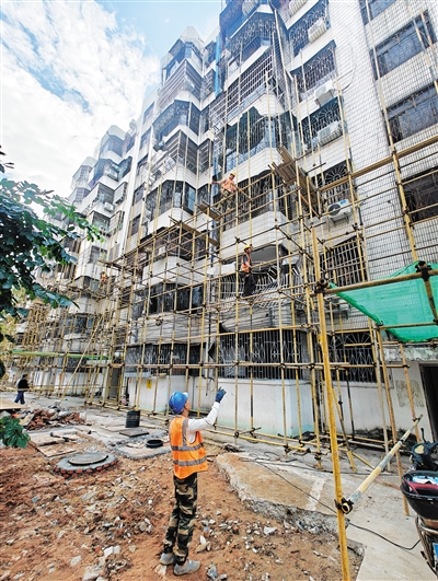 南国都市报11月28日讯(记者 姜飞 文/图)今年9月6日,超强台风“摩羯”过境海口期间,海口秀英阳光巴洛克项目工地上,一台塔吊遭台风侵袭折断砸向与之相邻的海口市第一砖厂宿舍,致使宿舍北区2号楼墙体部分开裂,住户家中出现不同程度墙壁开裂、批荡脱落等现象。11月27日,记者现场走访看到,施工单位已进驻小区开始对外墙进行修缮。不过,住户家中墙壁开裂等问题如何处理目前不得而知。