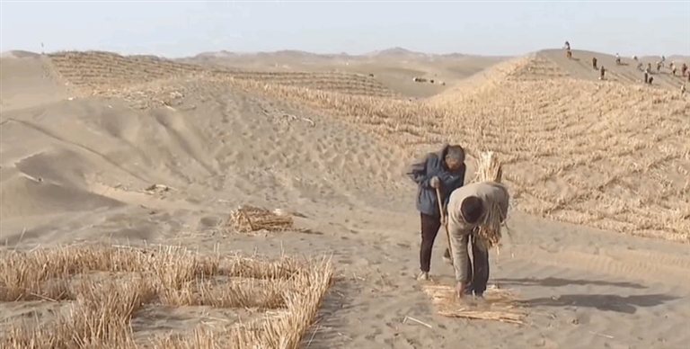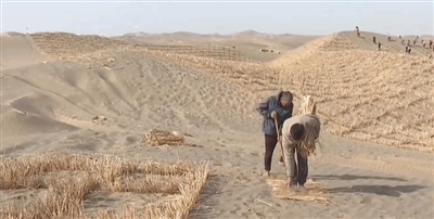 还有一支“老兵治沙队”,他们在沙漠里种植梭梭,和风沙搏斗。虽然树苗经常被风沙吹走,但是他们从不放弃,一年又一年地种下去,现在已经种下了1万余亩治沙生态林。