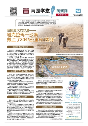 11月28日,我们国家在防治沙漠化方面传来好消息。塔克拉玛干沙漠长达3046公里的“绿色围脖”终于织成。这意味着,围着塔克拉玛干沙漠构筑起了一道坚固的绿色屏障,不让沙漠里的沙子到处乱跑,保护我们的家园。今天,就让我们一起去了解这些勇敢的人们是如何与沙漠作战的吧!