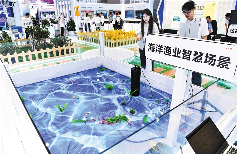 展区的正中央,4个常见类型的农业生产场景引众多参观者驻足,分别是水稻种植、蔬菜种植、果园、海洋渔业智慧场景。