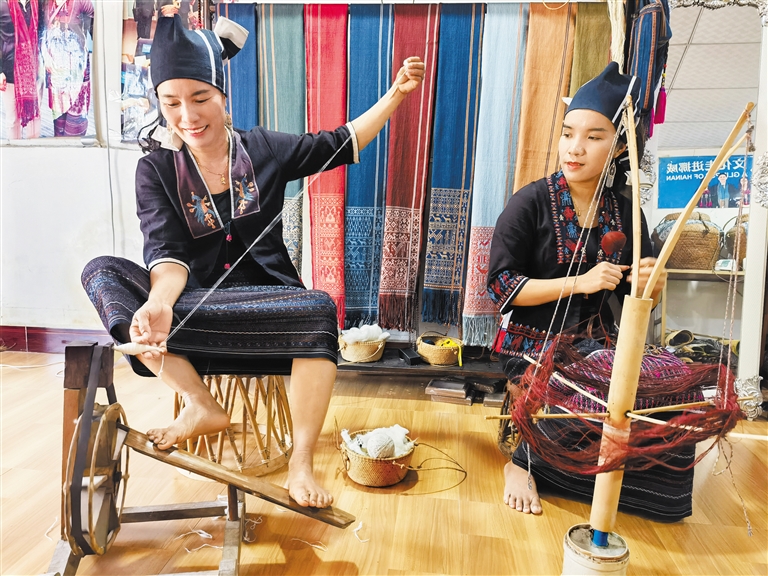 一条长2米,宽30厘米的黎锦,最快也要十多天织成;要经过纺线、染线、提花等多个步骤,黎锦技艺的纺染织绣一项不落。