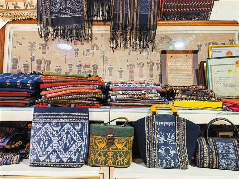 这份经历,让符仁玲的眼界更开阔。经过琢磨,黎锦手提包、黎锦耳环、黎锦发饰等文创产品摆上合作社的货架。新颖的黎锦产品呈现出既传统又时尚、既古老又年轻的形象,被更多消费者追捧。合作社每年能接到上百件订单,收入突破20万元。