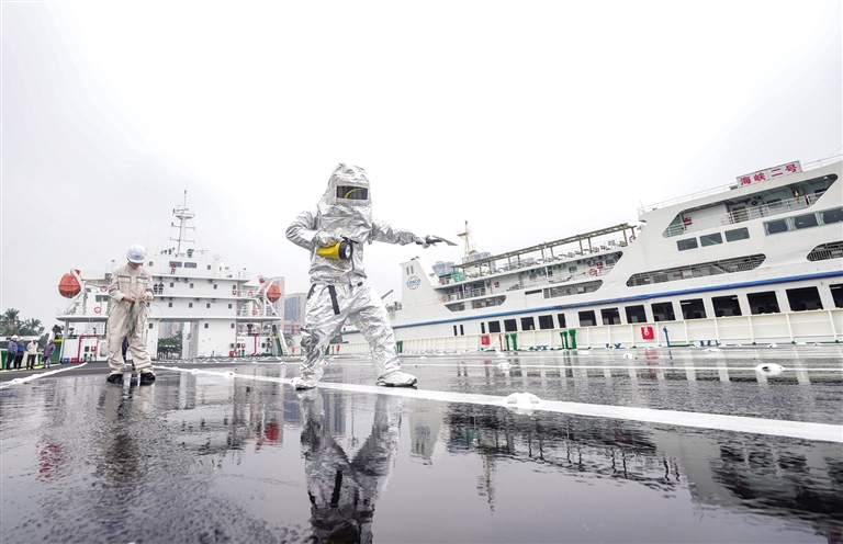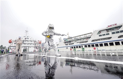 当天,海事工作人员组织船员开展了应急演练,现场模拟装车甲板一辆新能源车辆着火。通过开展应急演练检验船员事故预防和应对突发事件处置能力。