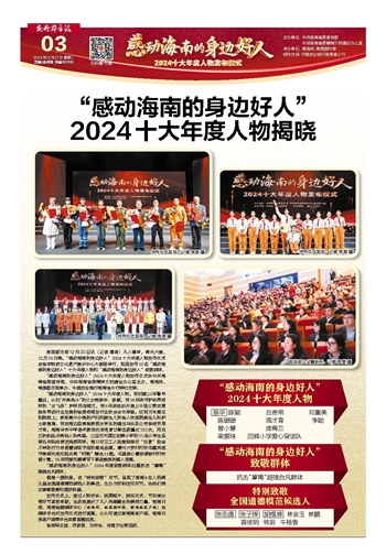 “感动海南的身边好人”2024十大年度人物发布仪式由中共海南省委宣传部、中共海南省委精神文明建设办公室主办,南海网、南国都市报承办,中国农业银行海南省分行特约支持。