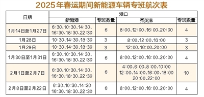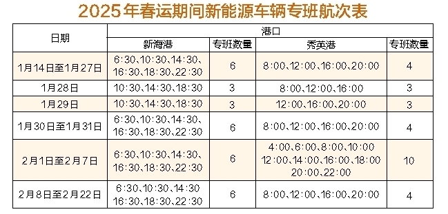 为进一步满足琼州海峡新能源车辆过海运输需求,根据当前新能源车辆进出岛需求情况,海峡股份于1月14日(春运当天)起调整新能源车辆专班航次。请广大新能源车辆旅客提前做好出行计划,购买好春节出行往返船票。