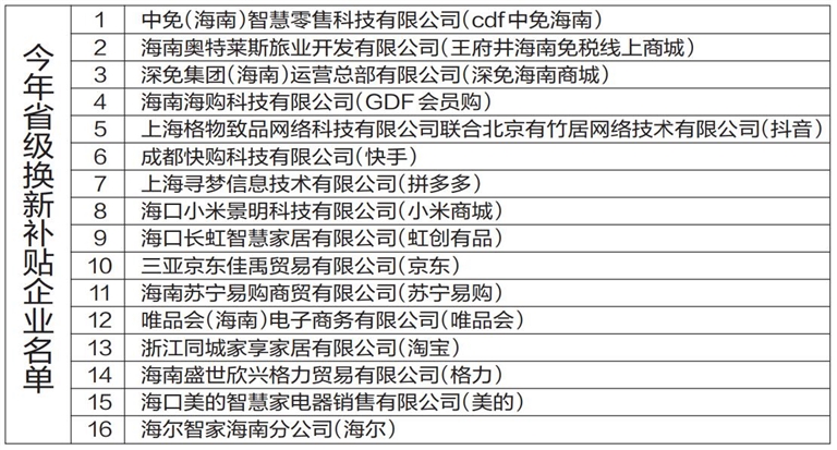 南国都市报2月6日讯(记者 王子遥)2月6日,海南省商务厅发布了《关于“2025年海南省家电、手机等数码产品、家装家居换新补贴”线上参与平台企业结果的公示》,经过企业申报与相关审核,共有16家线上平台入选公示范围,拟参与2025年海南省家电、手机等数码产品、家装家居换新补贴活动。